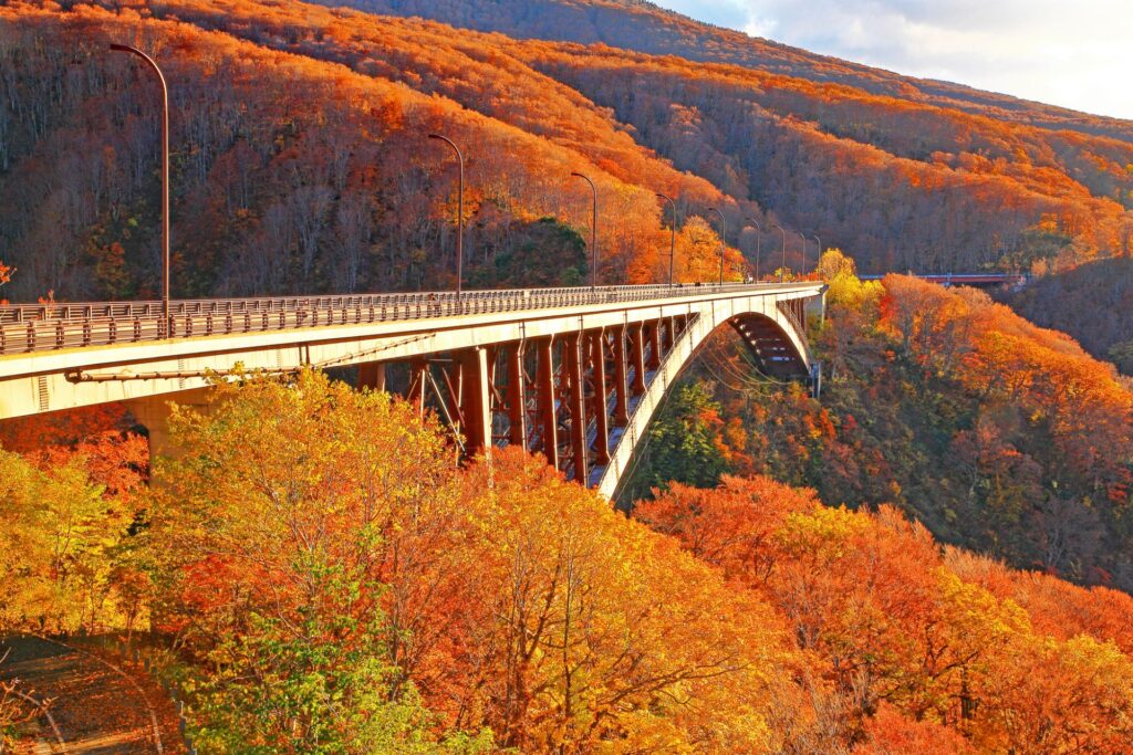 Stop by at Naruko Gorge this morning, one of the most scenic in Tohoku. Stretching a distance of 2.5km along the Arao river and with a depth of 100m, the gorge is a spectacular place to admire the magnificence of nature, especially when dyed in the fiery hues of autumn.