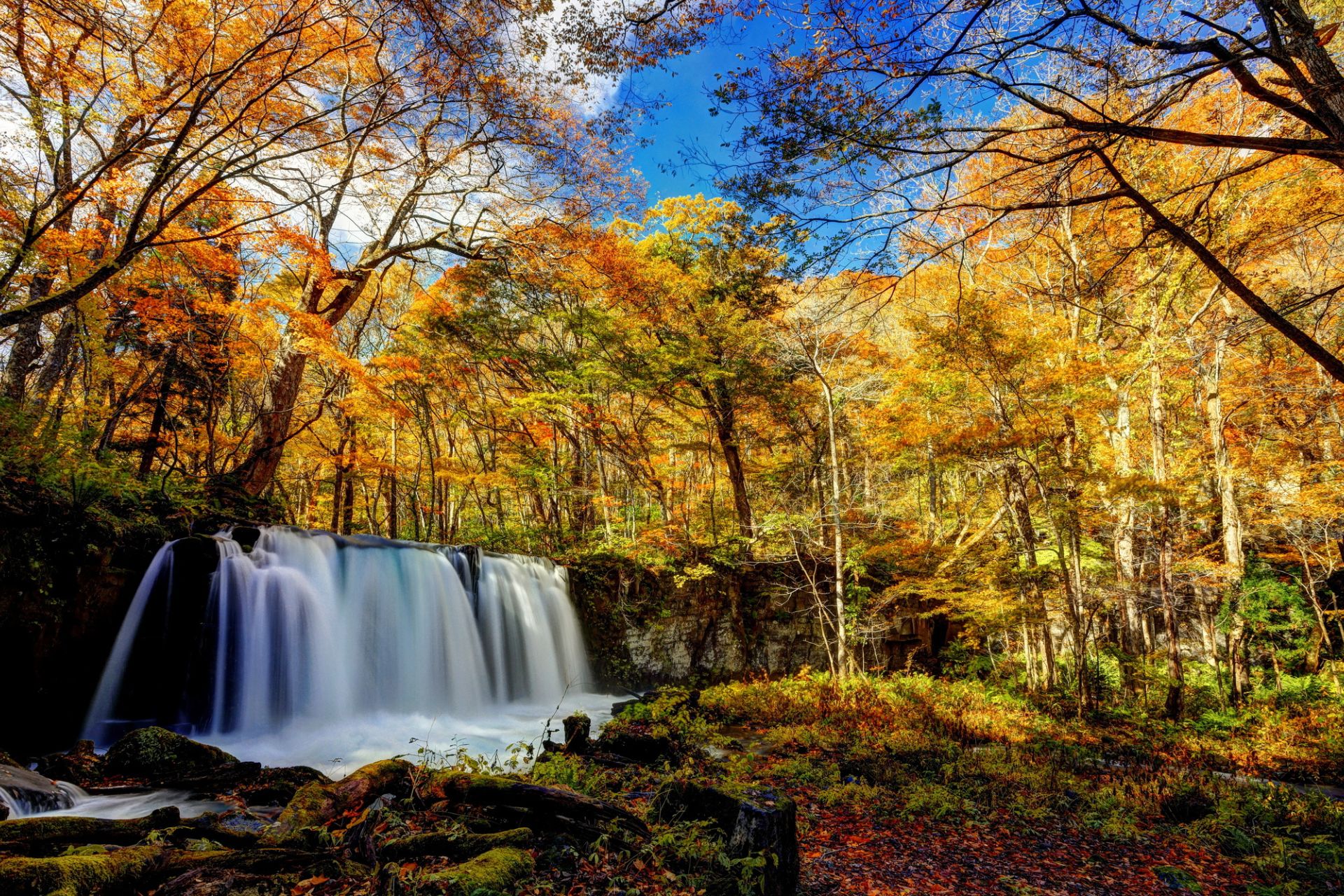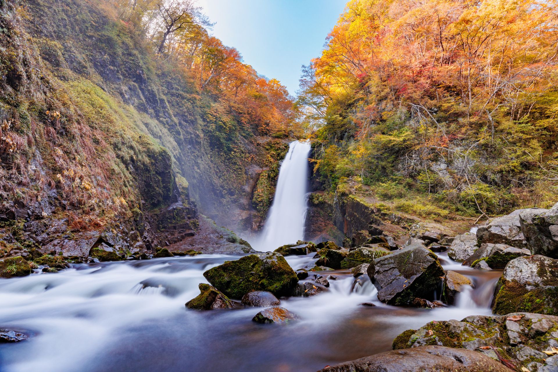 Later, visit Dakigaeri Gorge, one of the most beautiful valleys in the Tohoku region. Its name comes from the words “daki” (to hug) and “kaeri” (to switch) as the trekking path in the past was so narrow that people coming from opposite directions had to hug each other to pass through. An iridescent blue stream runs through the gorge, surrounded by fantastic autumn foliage on the magnificent mountains. A short walk along the hiking trail will bring you to the impressive Mikaeri Waterfall, a hidden cascade in the forest.